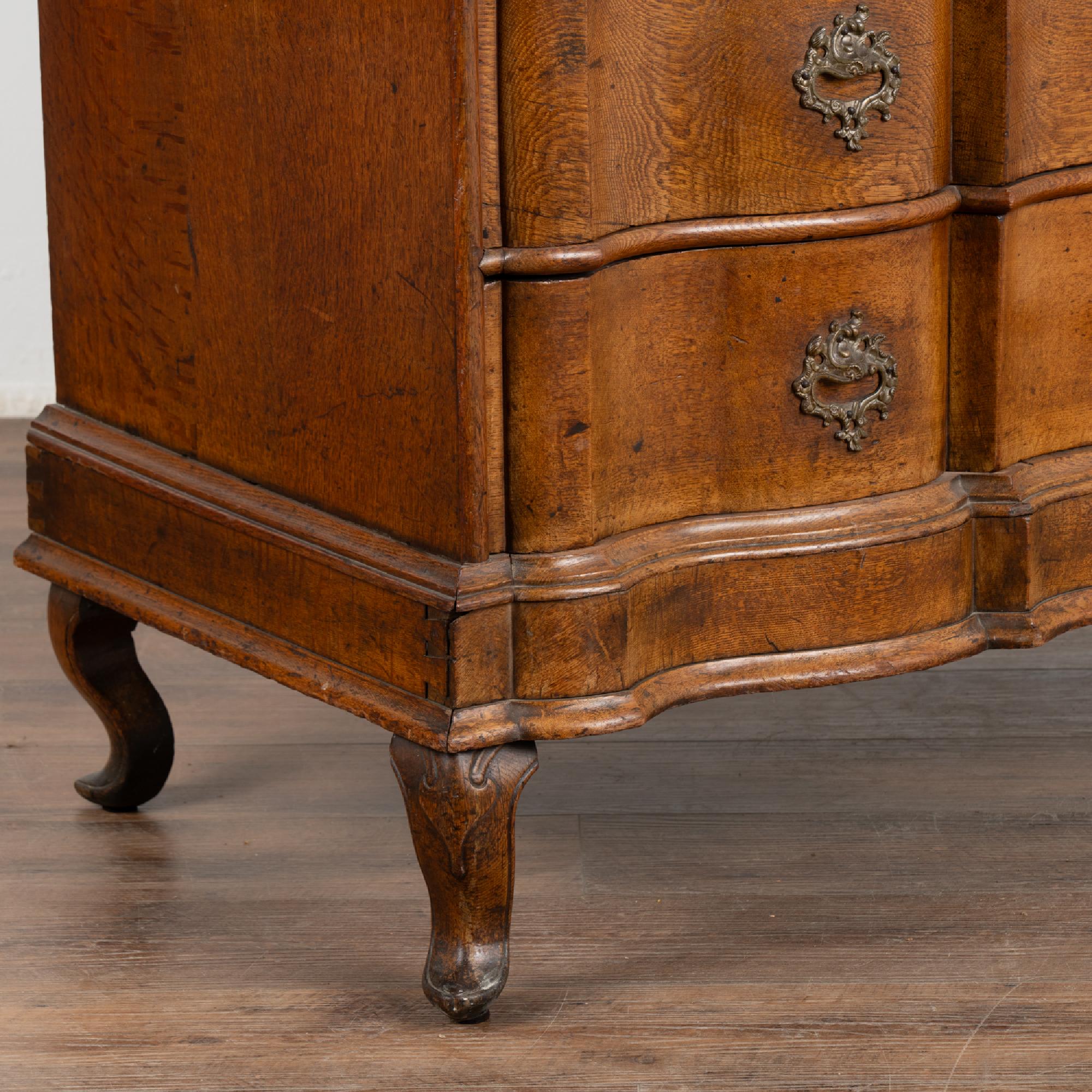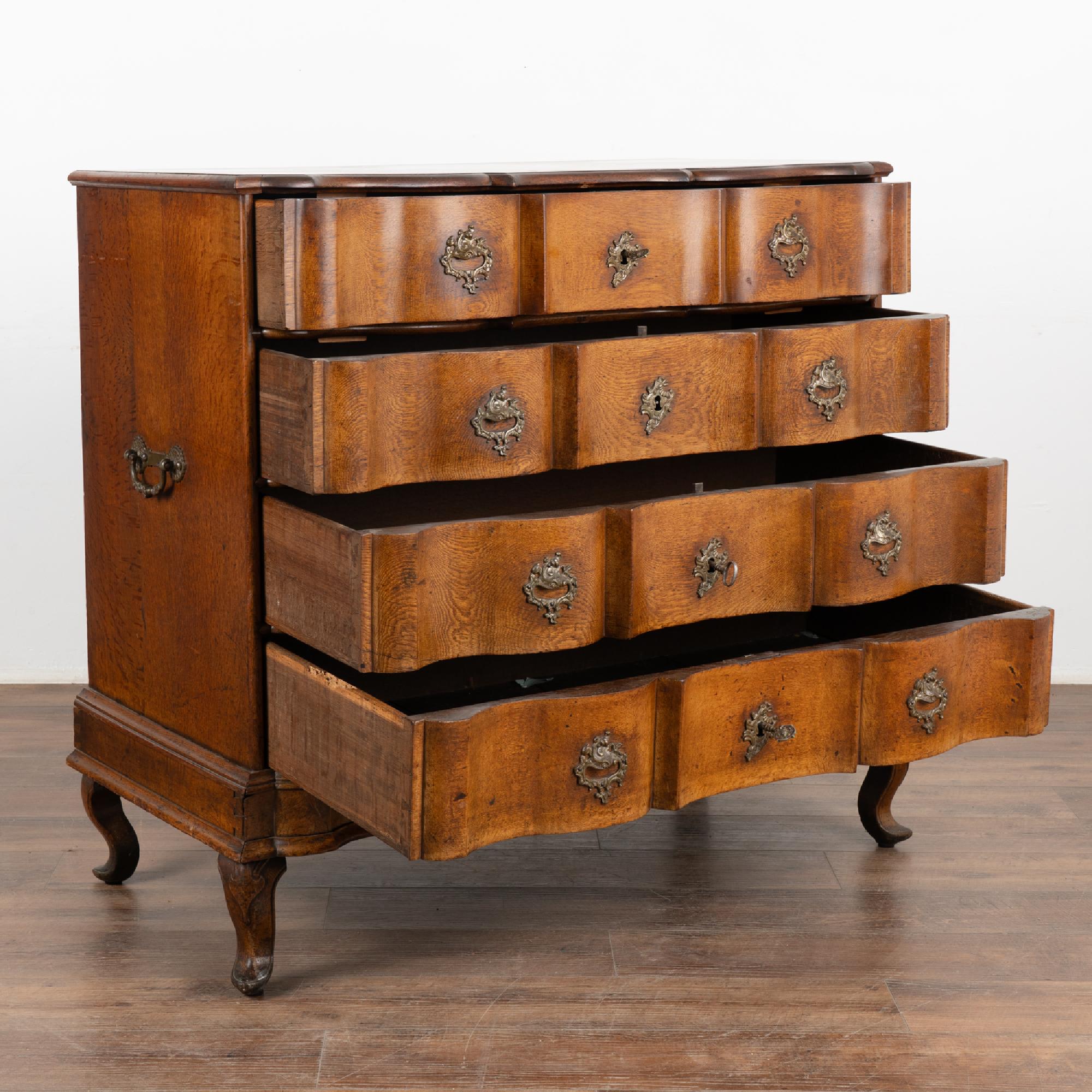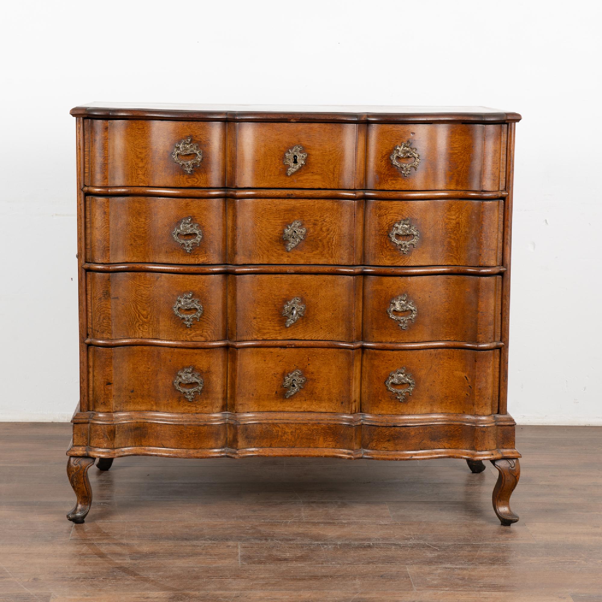 This large antique rococo oak chest of drawers features a serpentine front, handsome brass hardware pulls and rests on cabriolet feet.