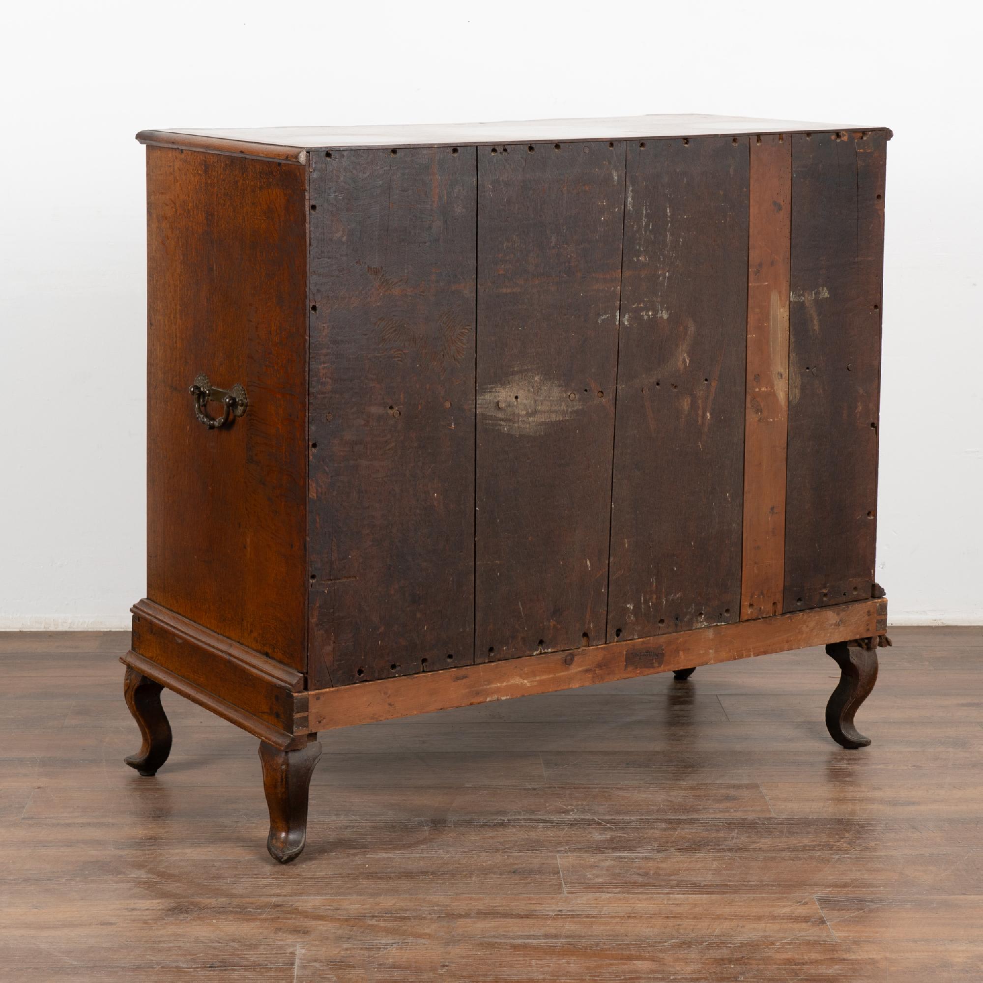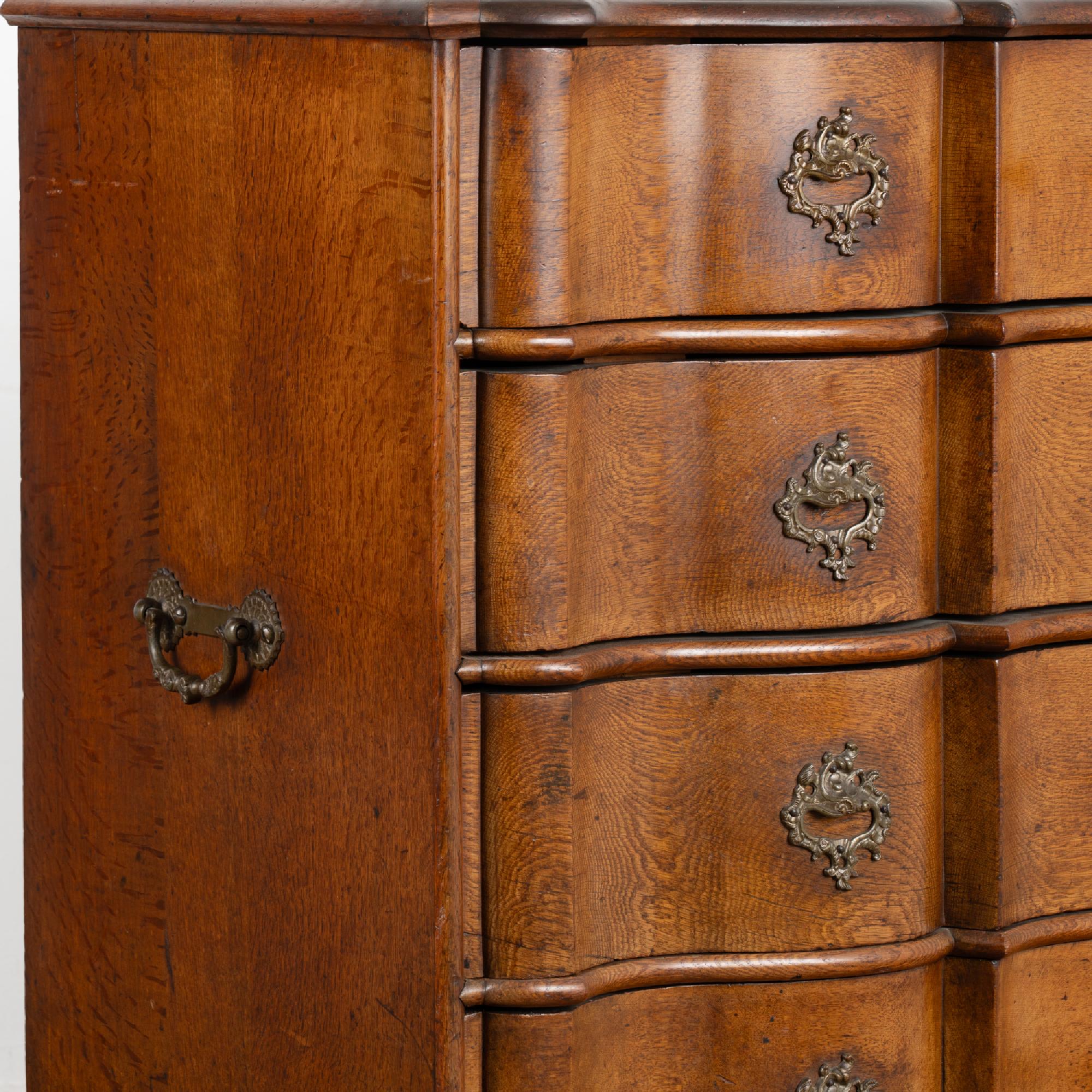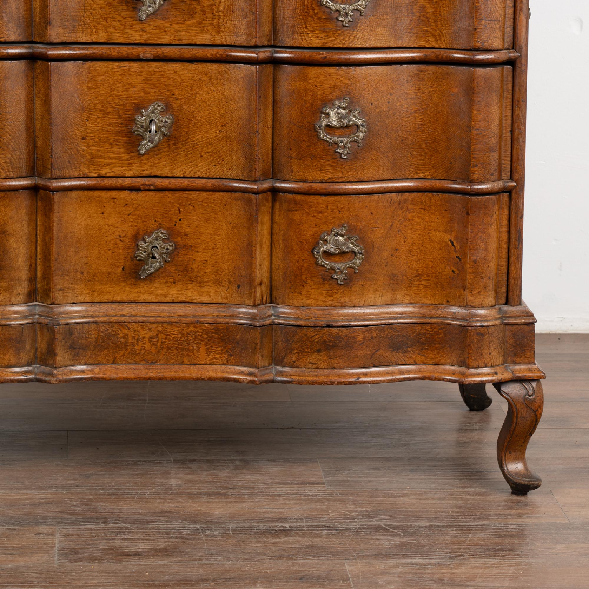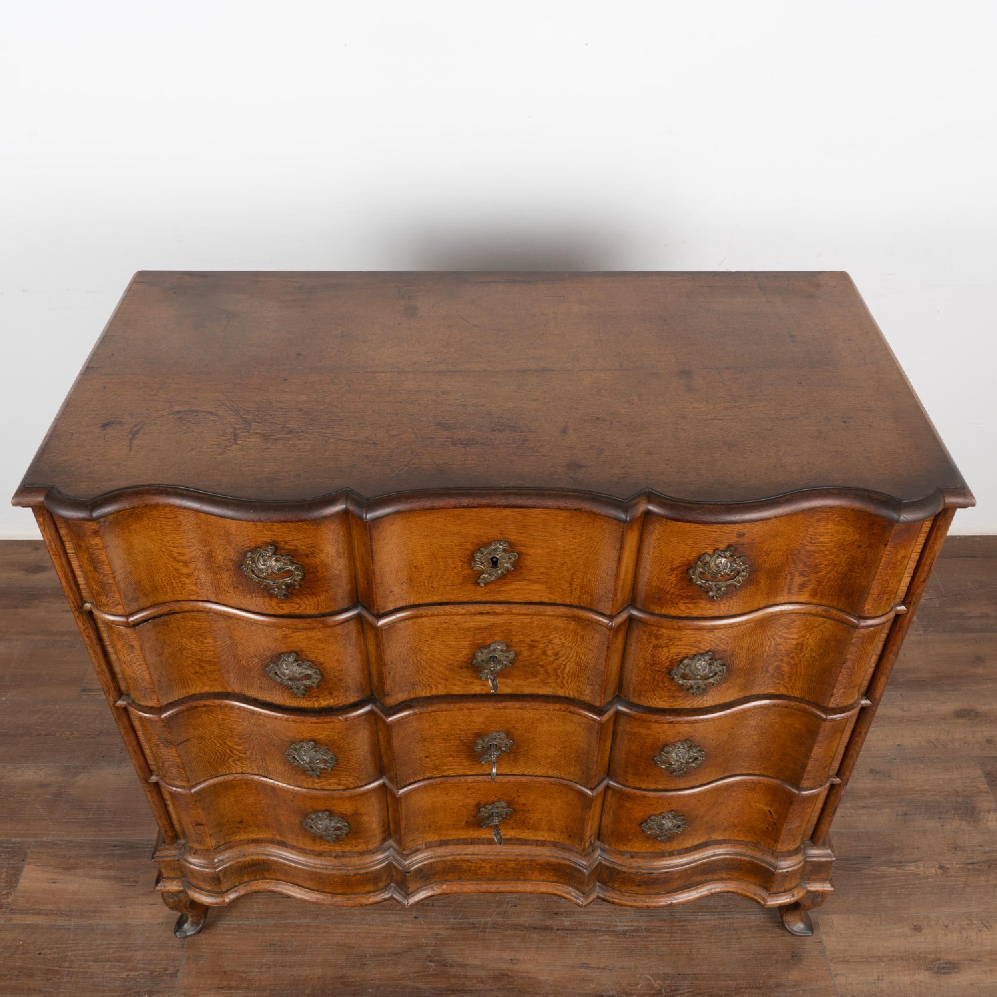 This large antique rococo oak chest of drawers features a serpentine front, handsome brass hardware pulls and rests on cabriolet feet.