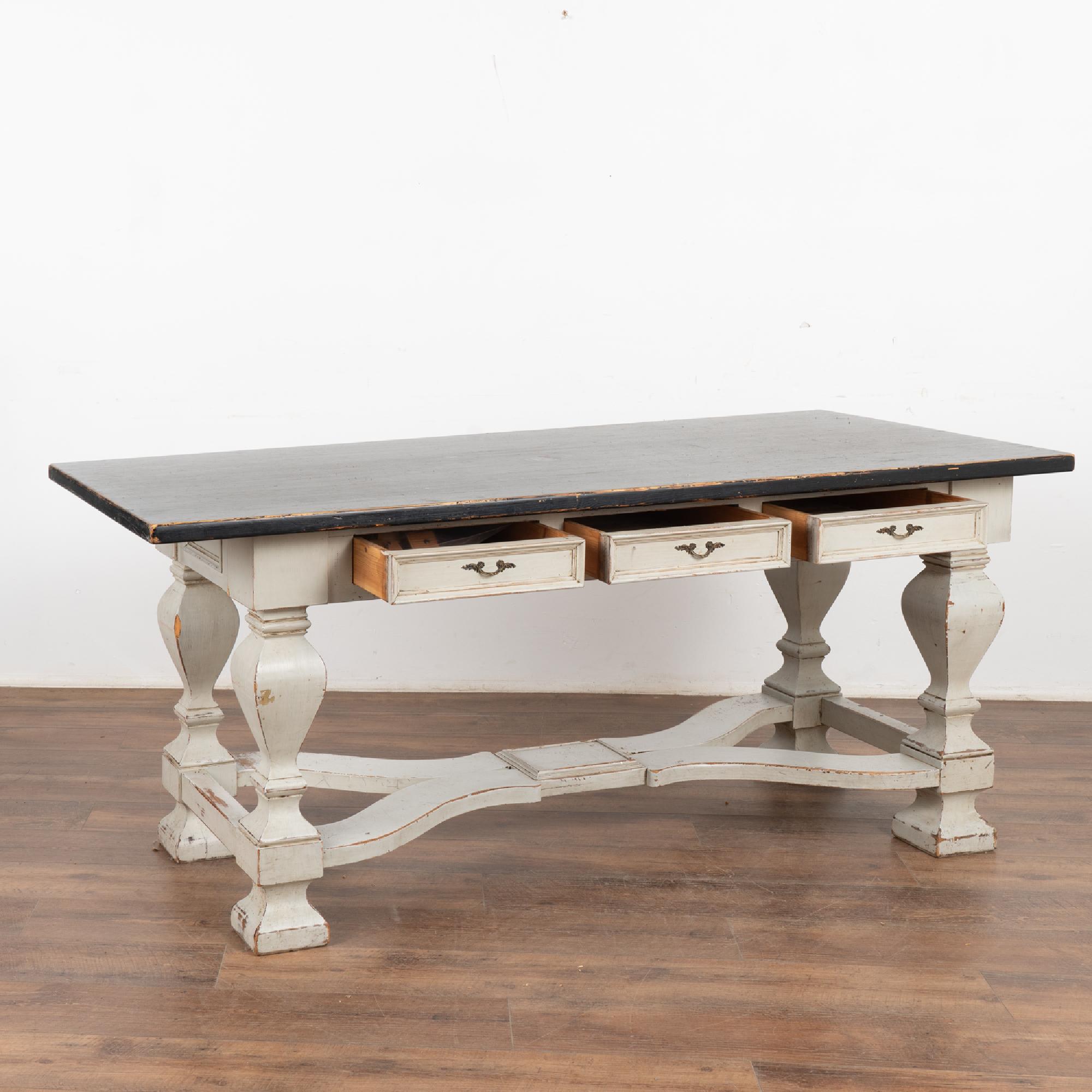 The base has been given a newer, professionally applied layered antique gray painted finish and is lightly distressed revealing the natural wood below while complimenting the contrasting black painted top.