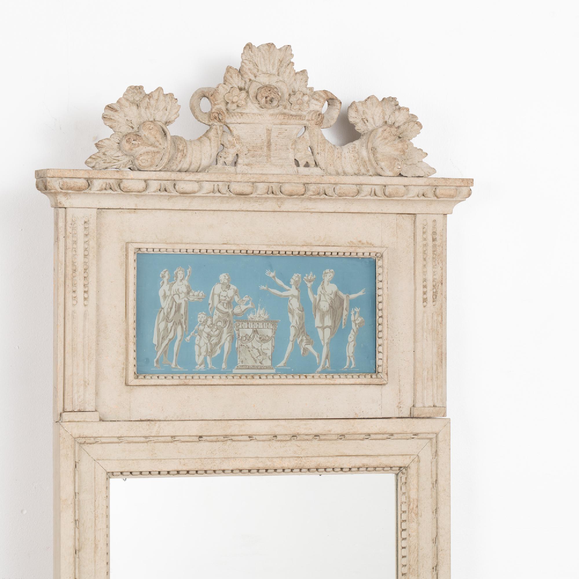 Tall decorative trumeau mirror with carved accents. Upper section portrays Greek figures against a blue painted background.
