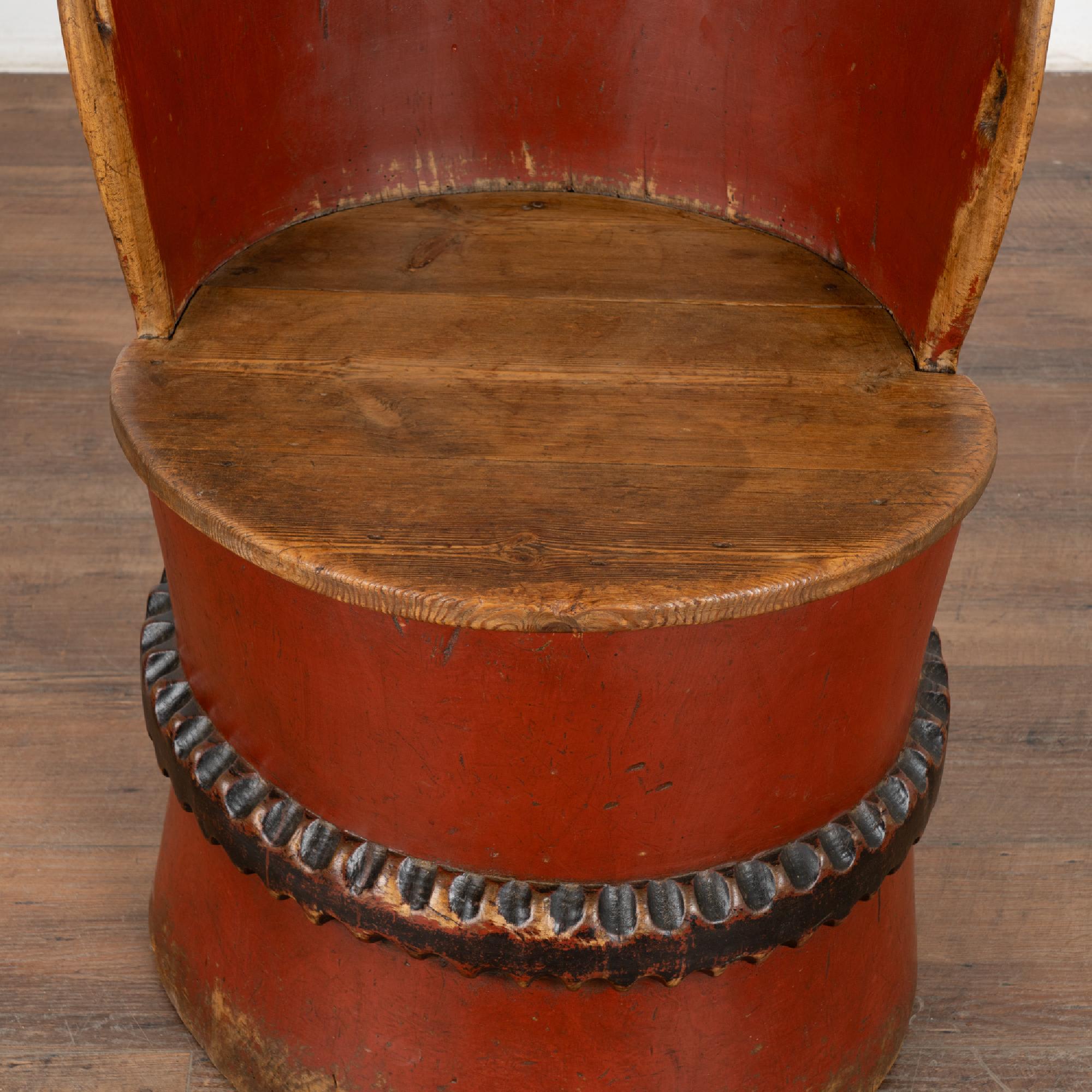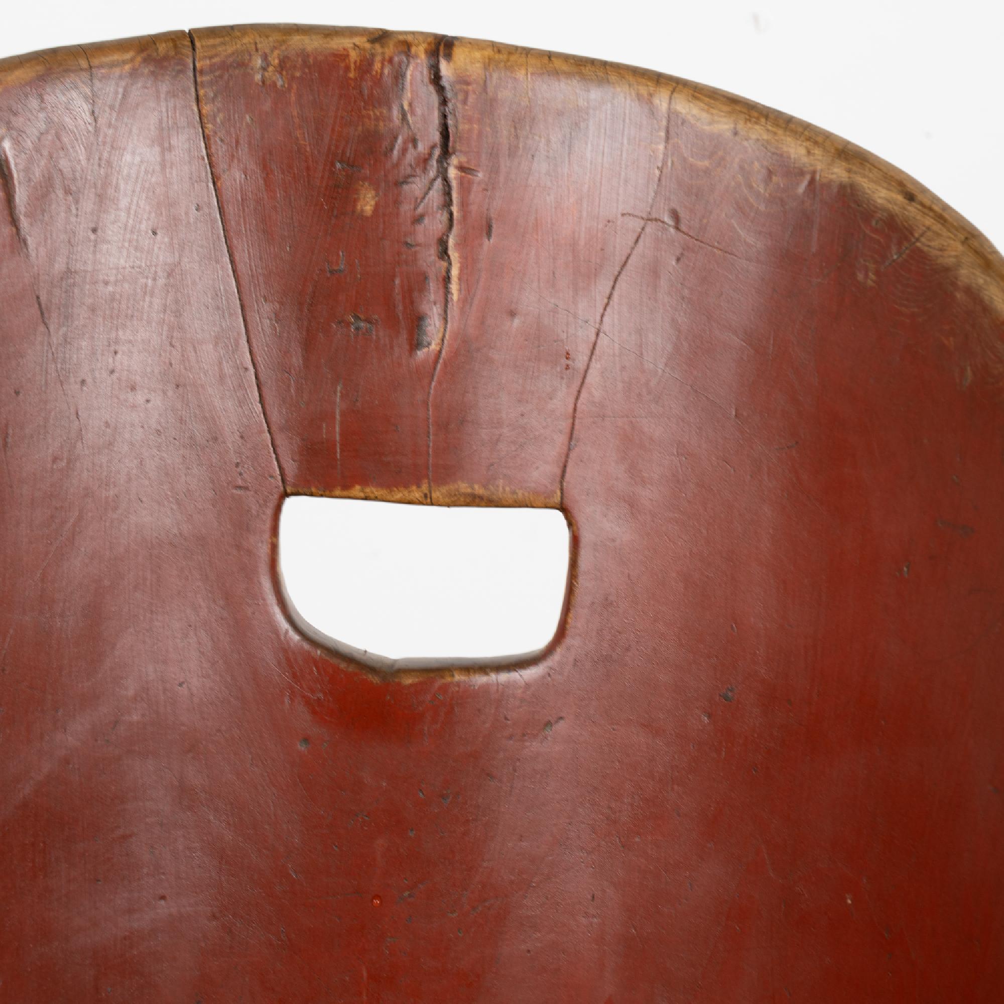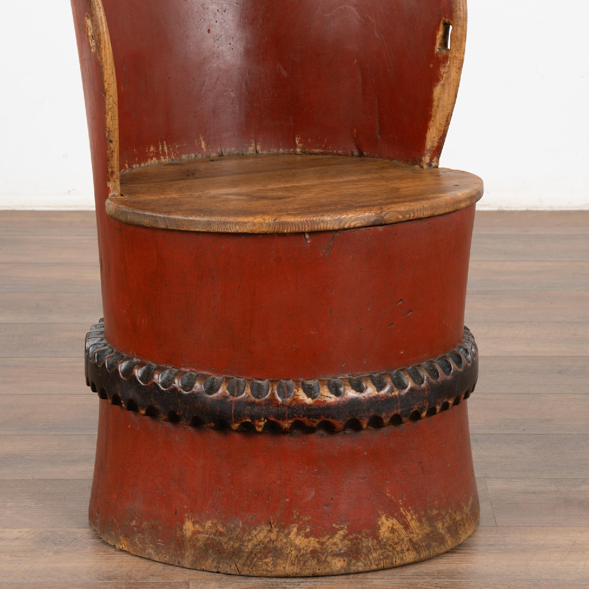 The lovely original red paint is accented by a carved and black painted band. Much of the original finish is worn down to the natural wood below adding an aged patina.