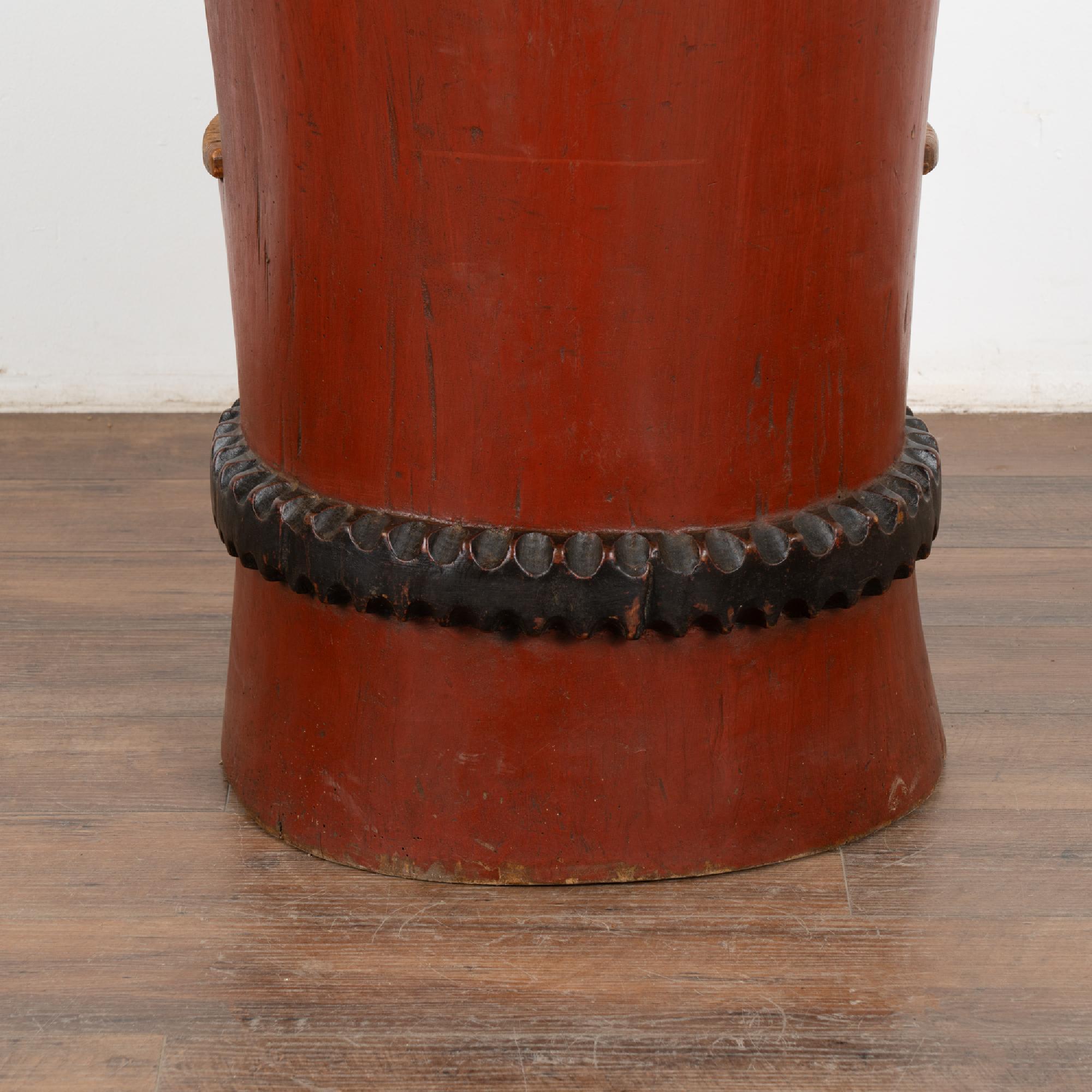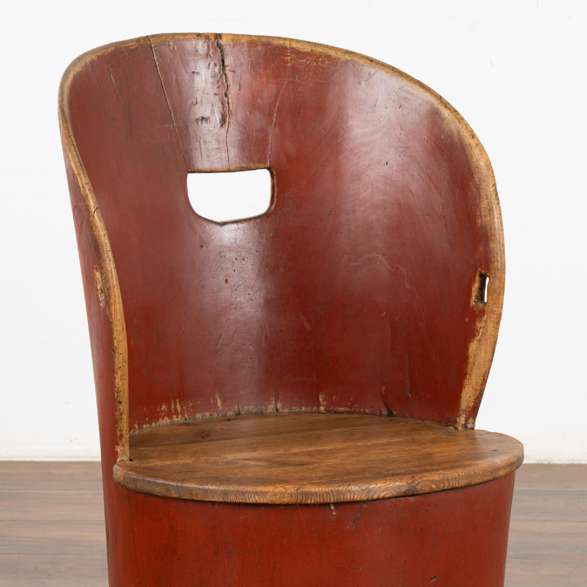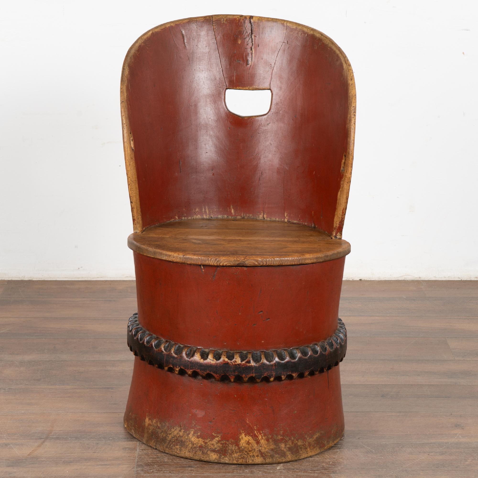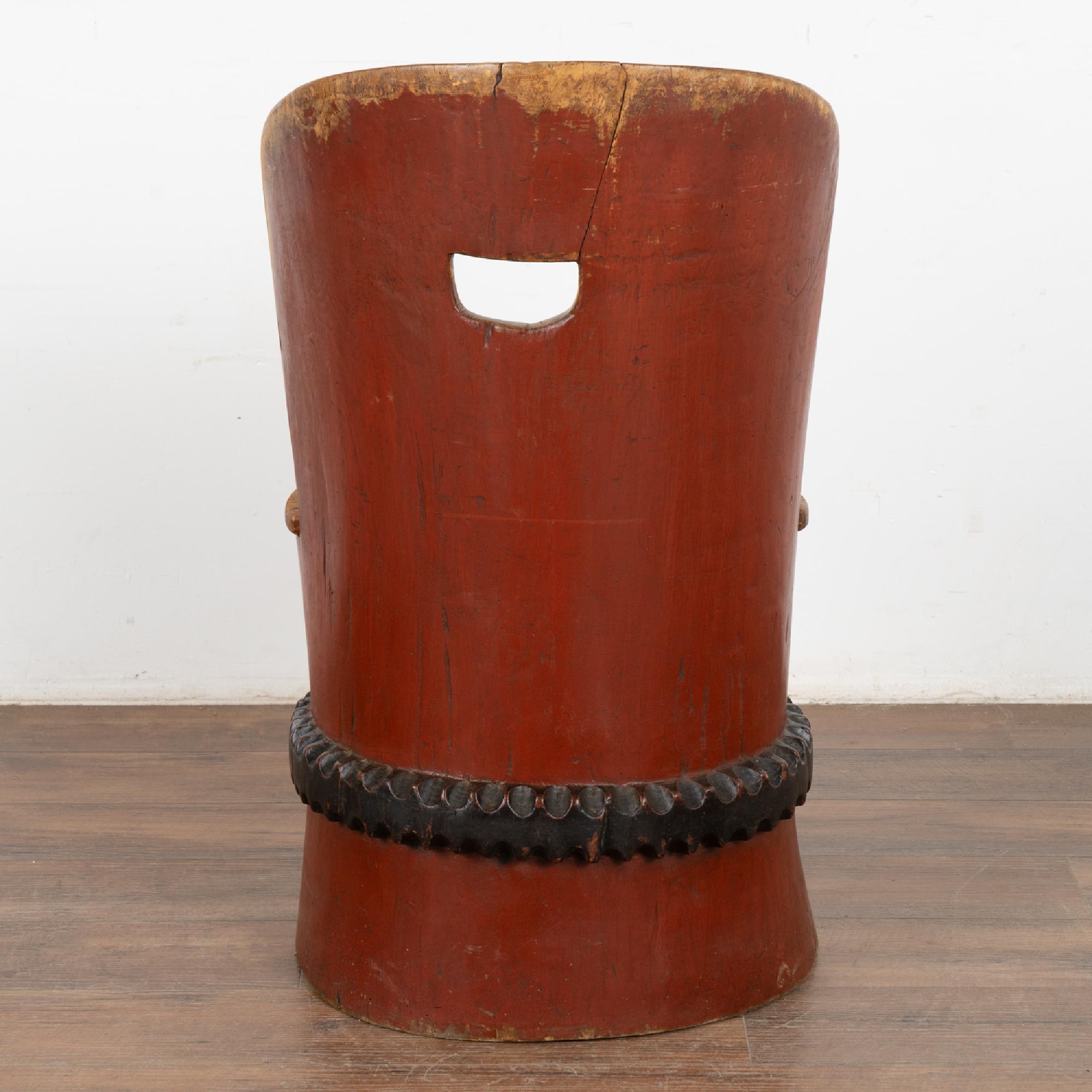 The lovely original red paint is accented by a carved and black painted band. Much of the original finish is worn down to the natural wood below adding an aged patina.