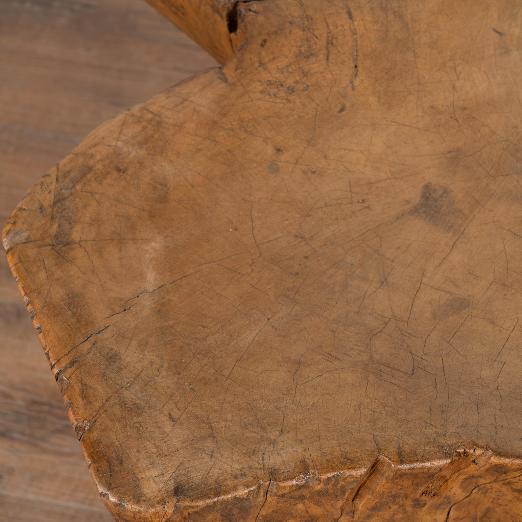 The 9" thick top rests on heavy rounded legs and trestle base. There is an indentation in the center of the table top seen in the photos.