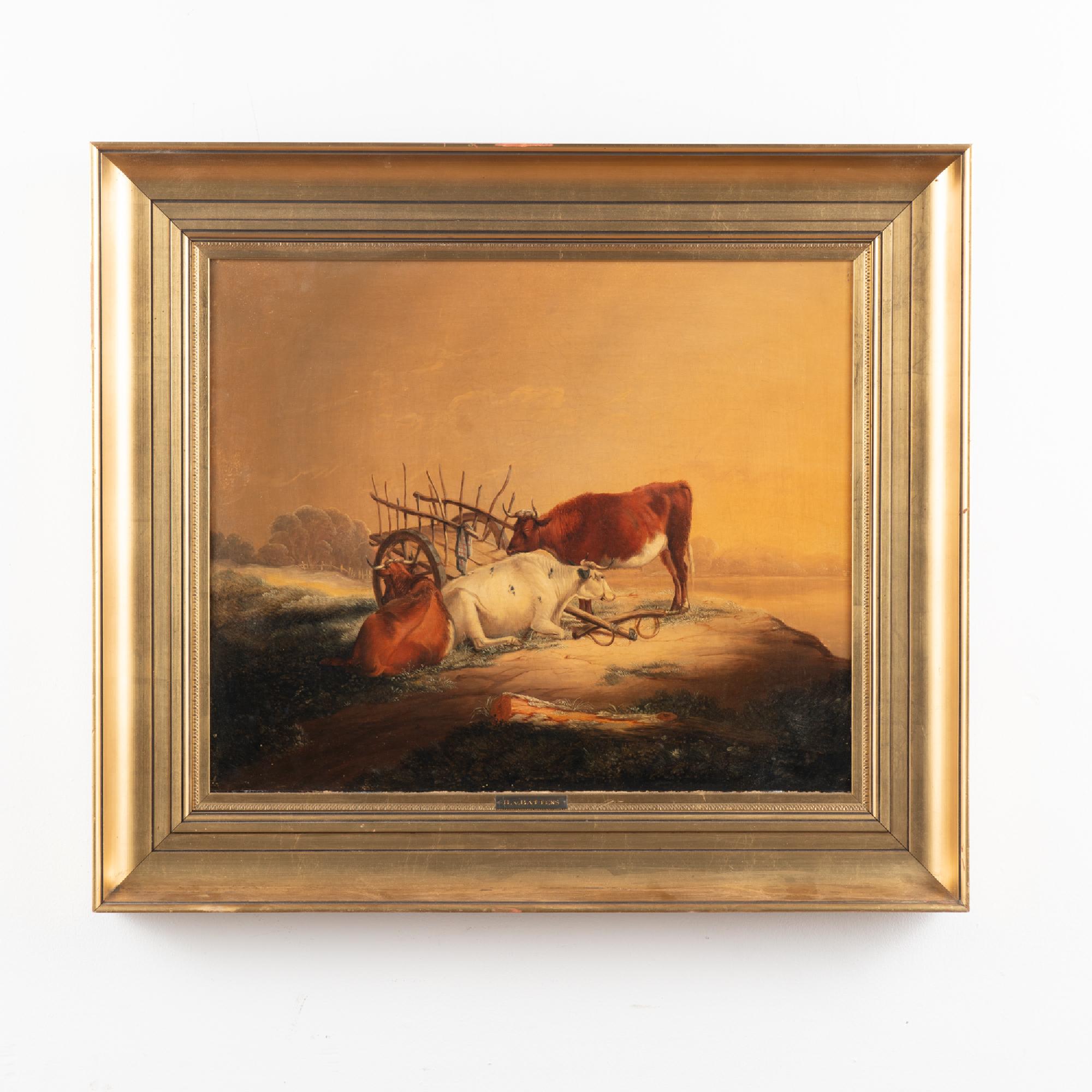 Original oil on canvas landscape painting of three cows laying beside cart and yoke. The golden glow creates the feeling of dusk approaching.