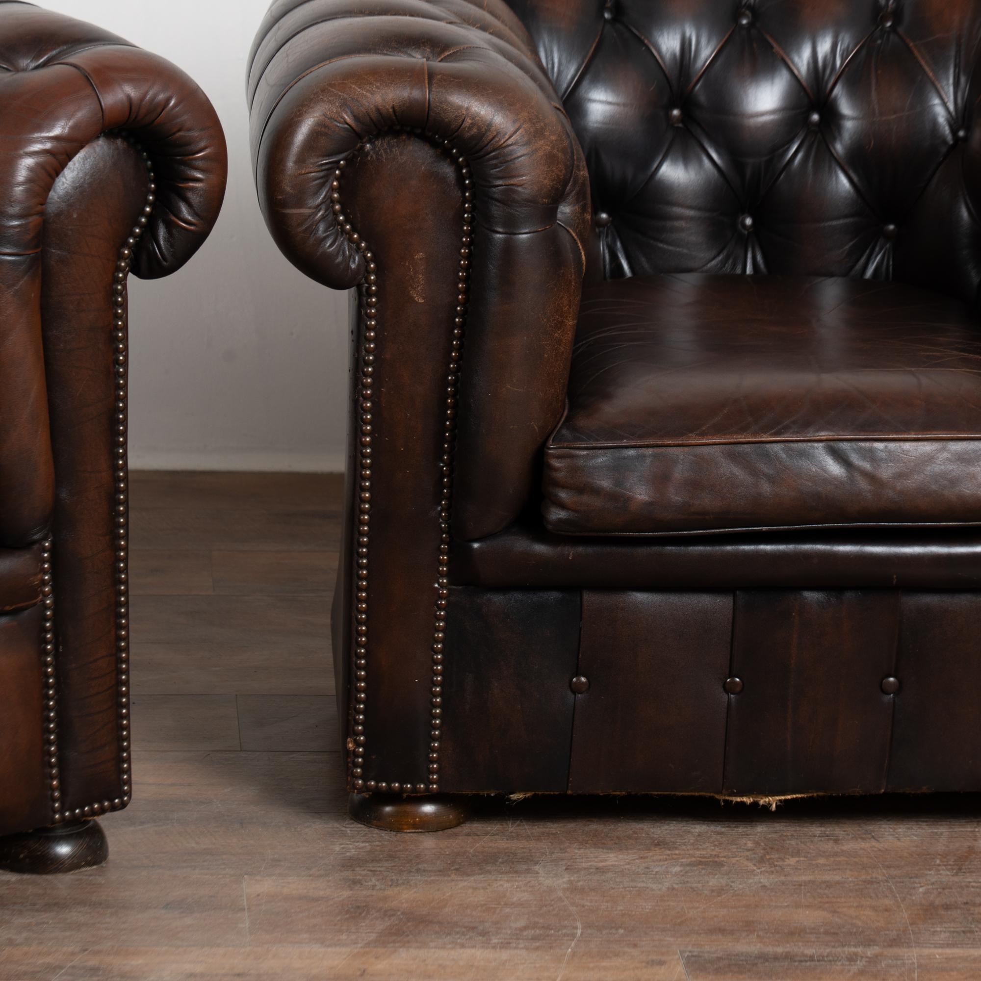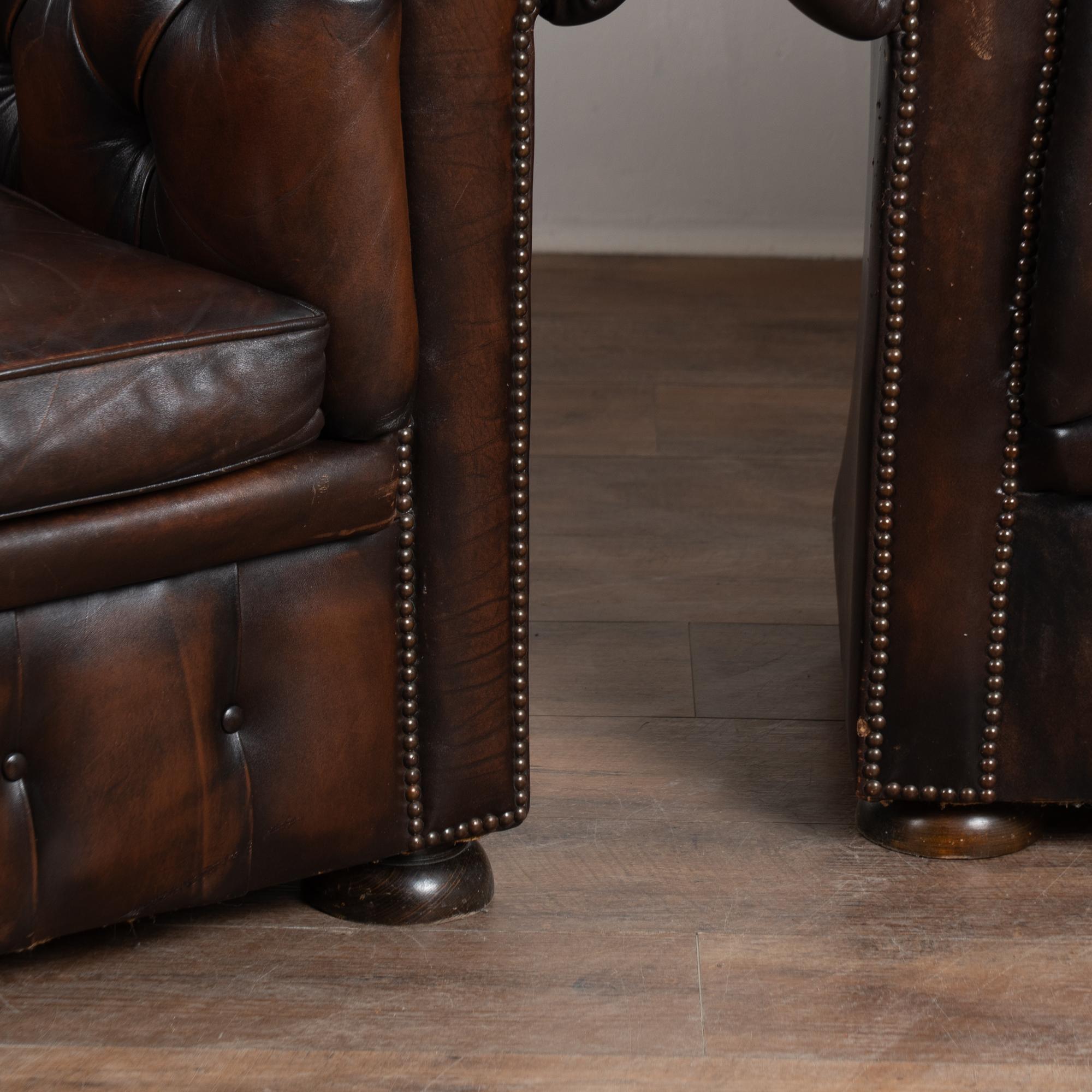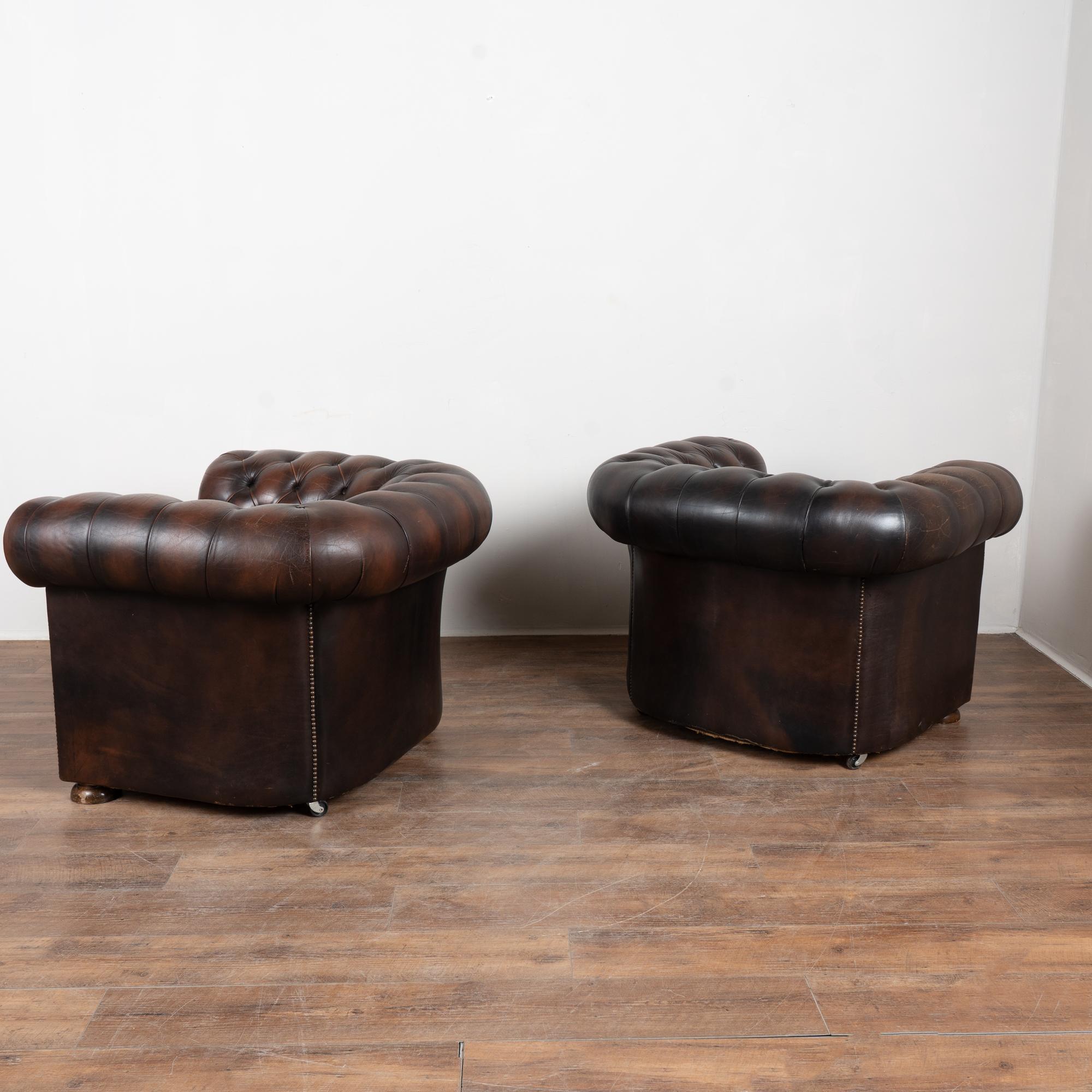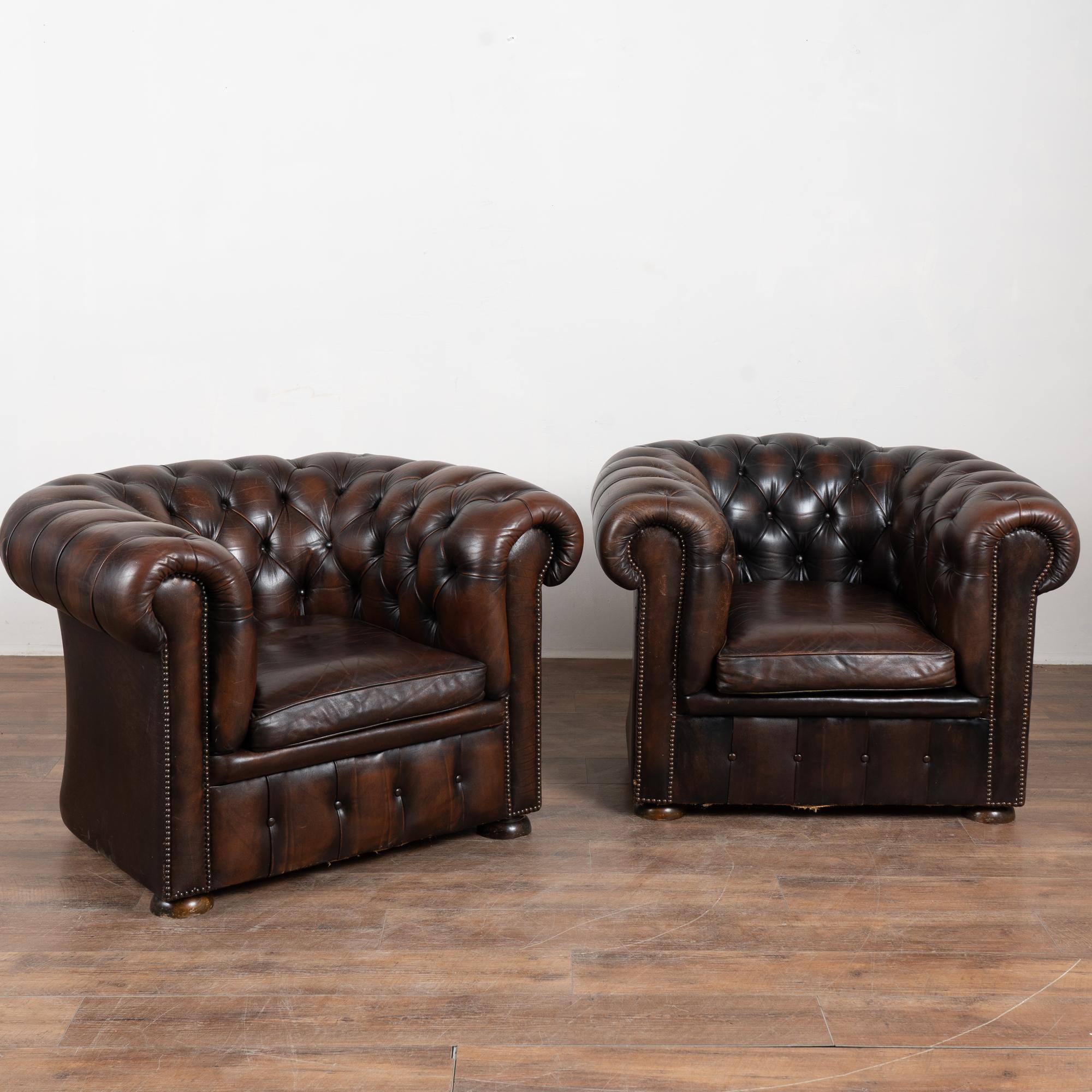 Pair, vintage brown leather chesterfield club arm chairs resting on bun feet.
