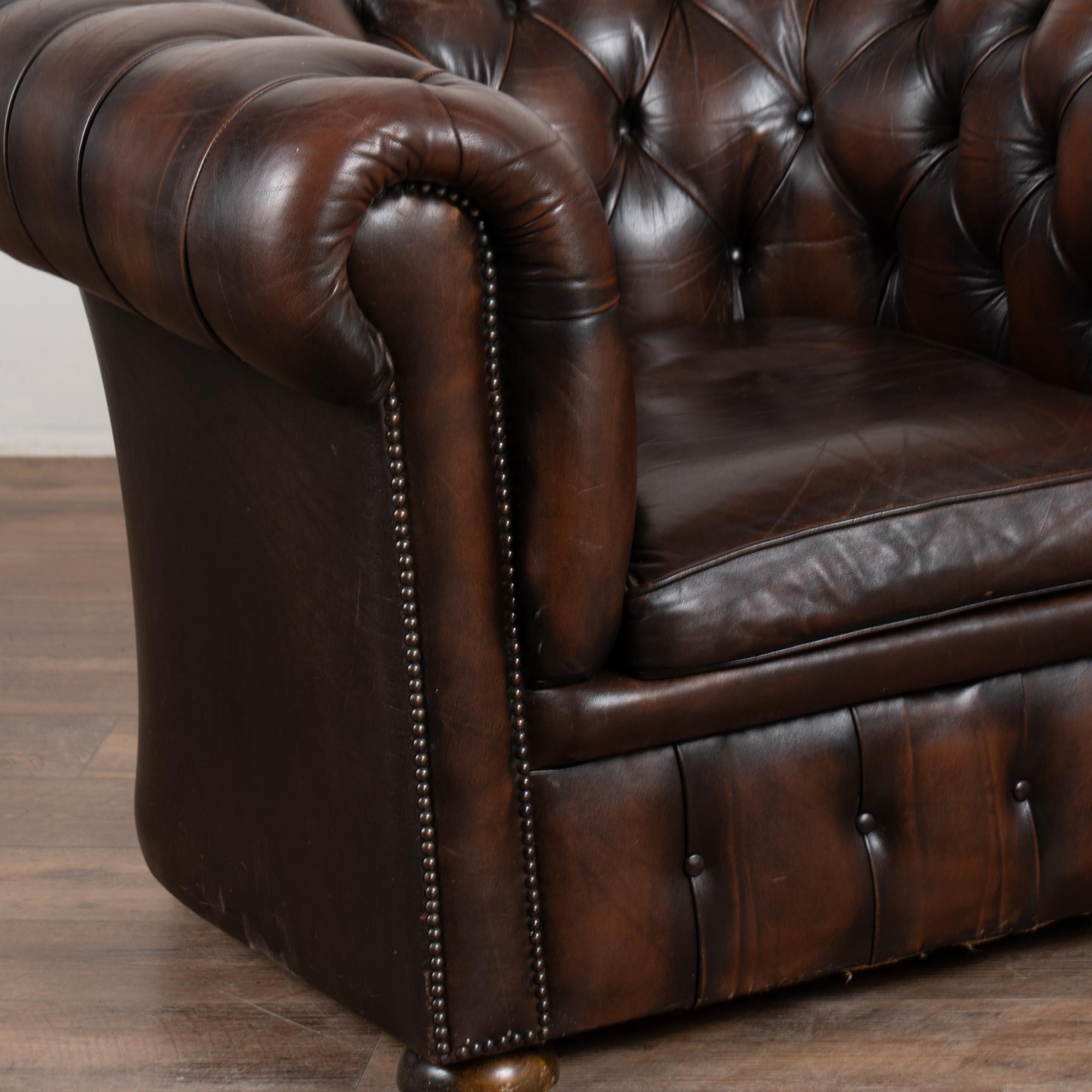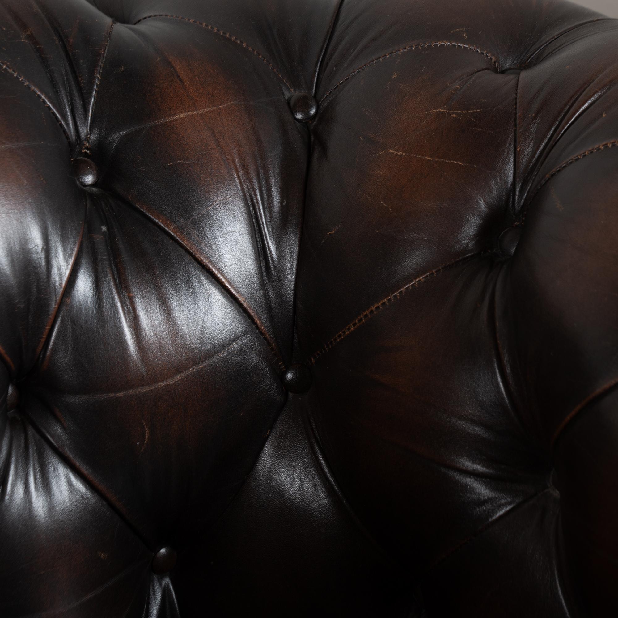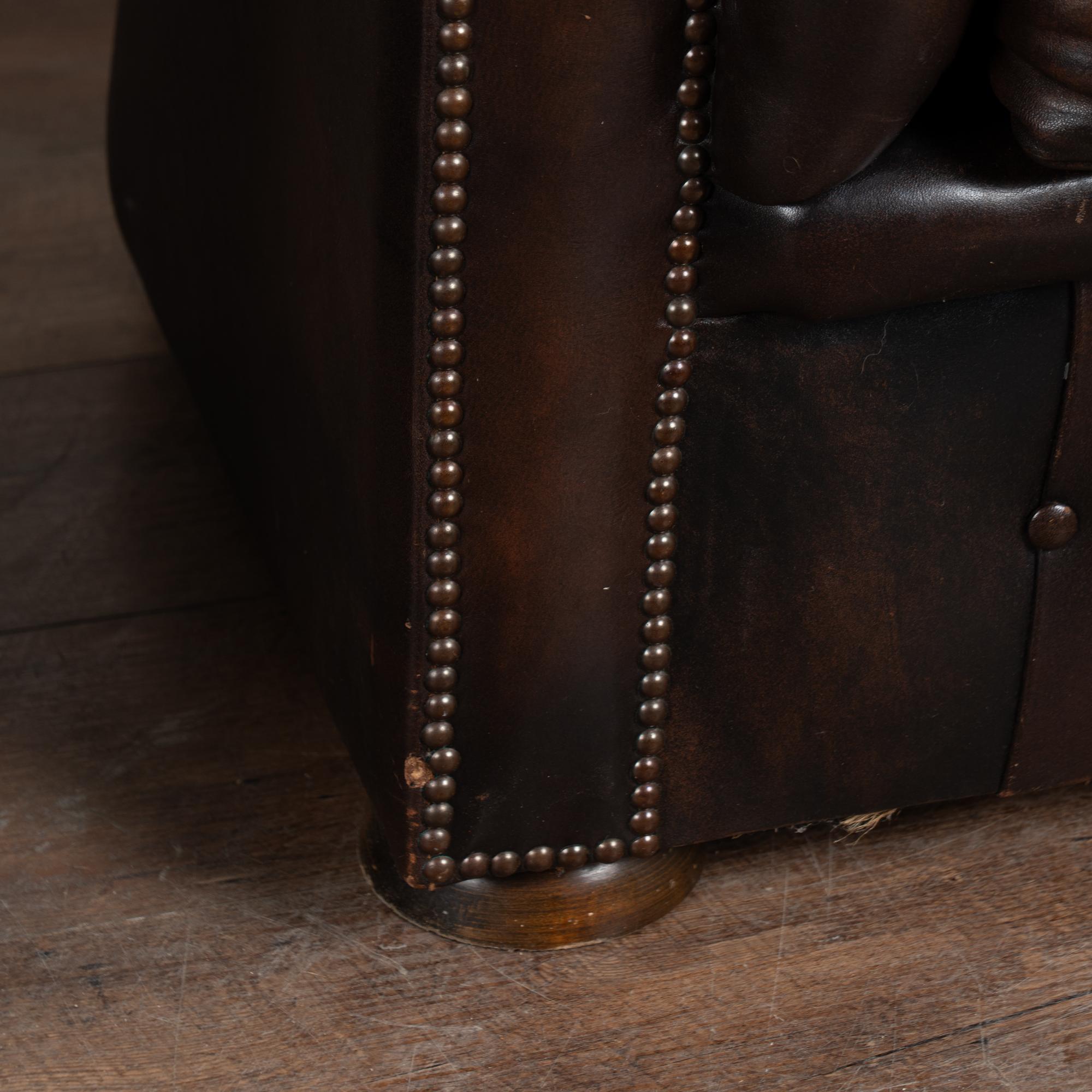 Upholstered in tight button-tufted dark brown leather with nail head trim, rolled arms and loose seat cushions.