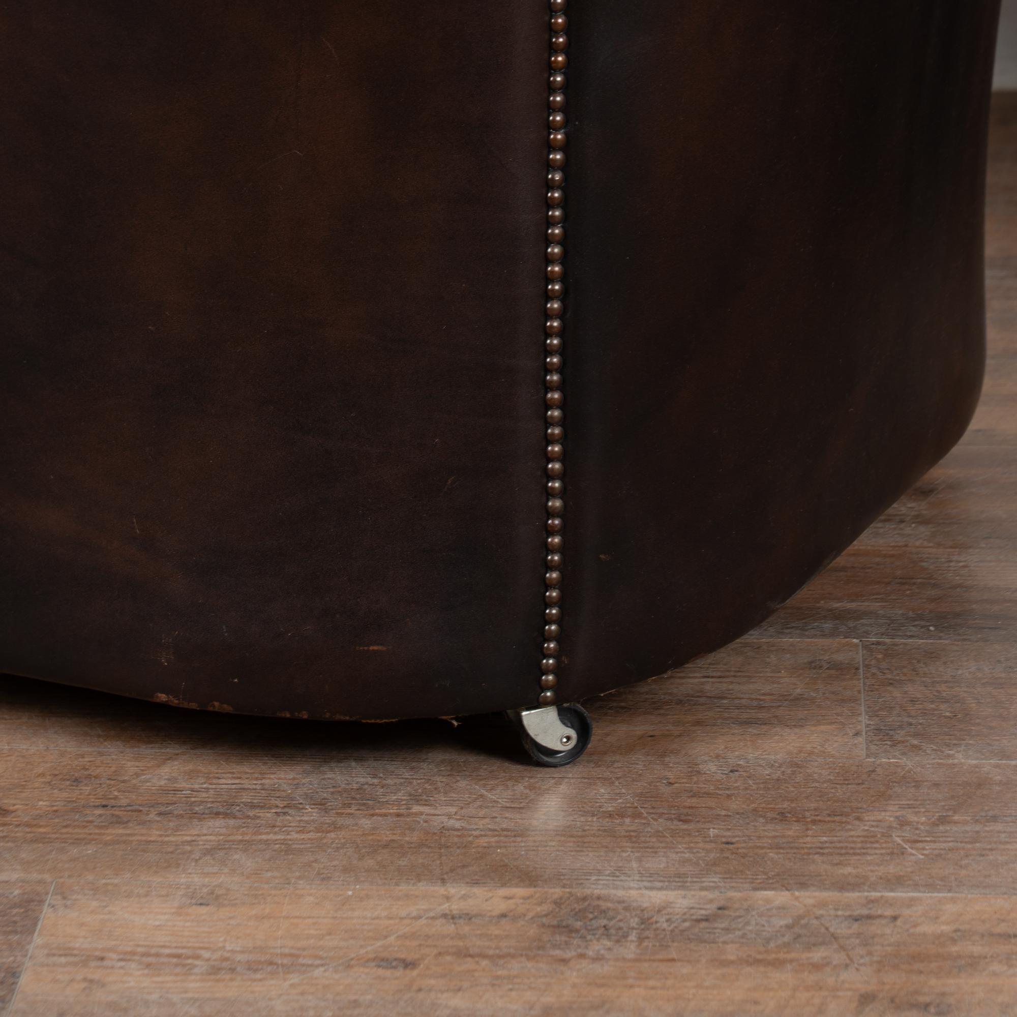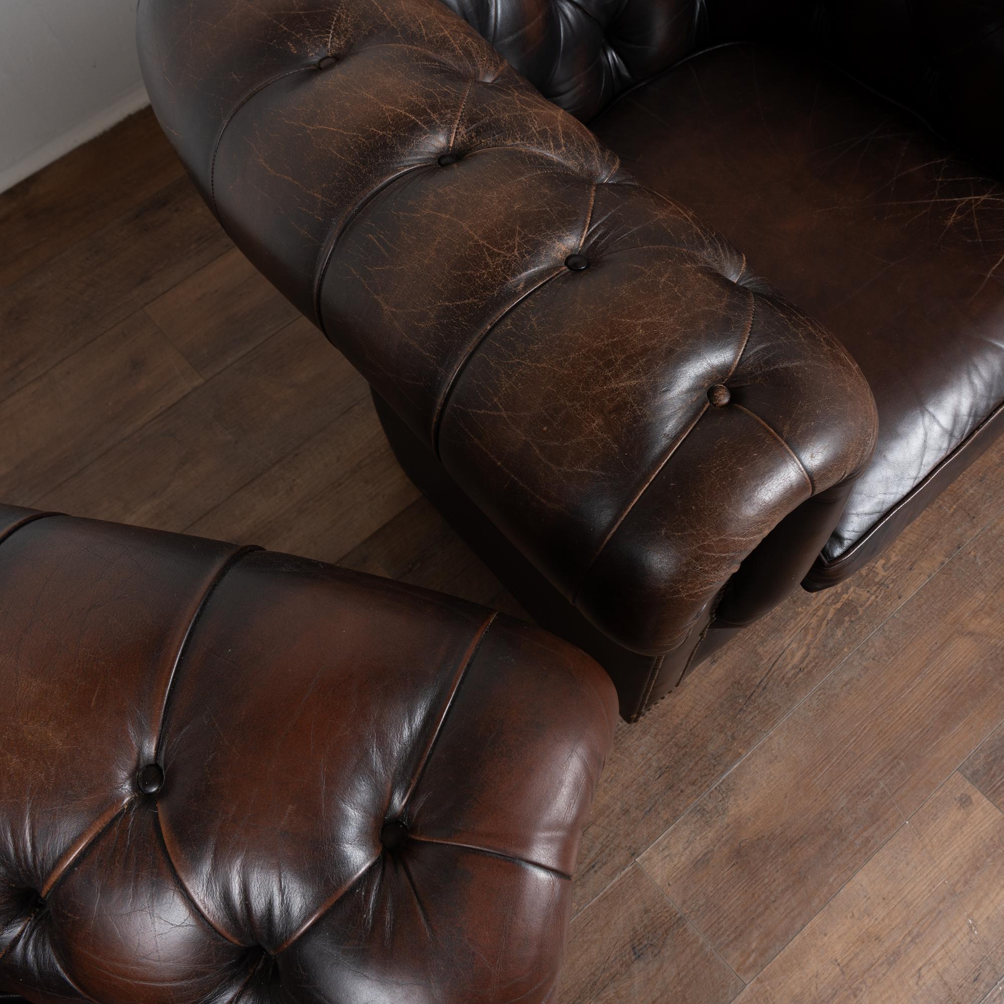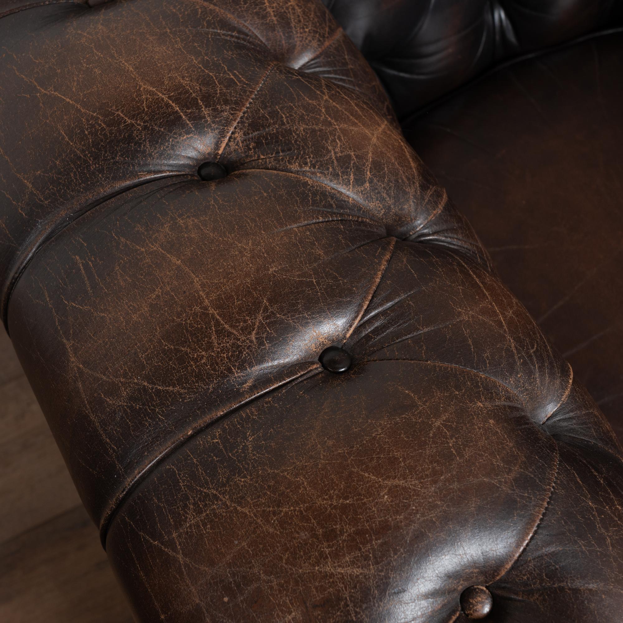 Upholstered in tight button-tufted dark brown leather with nail head trim, rolled arms and loose seat cushions.
