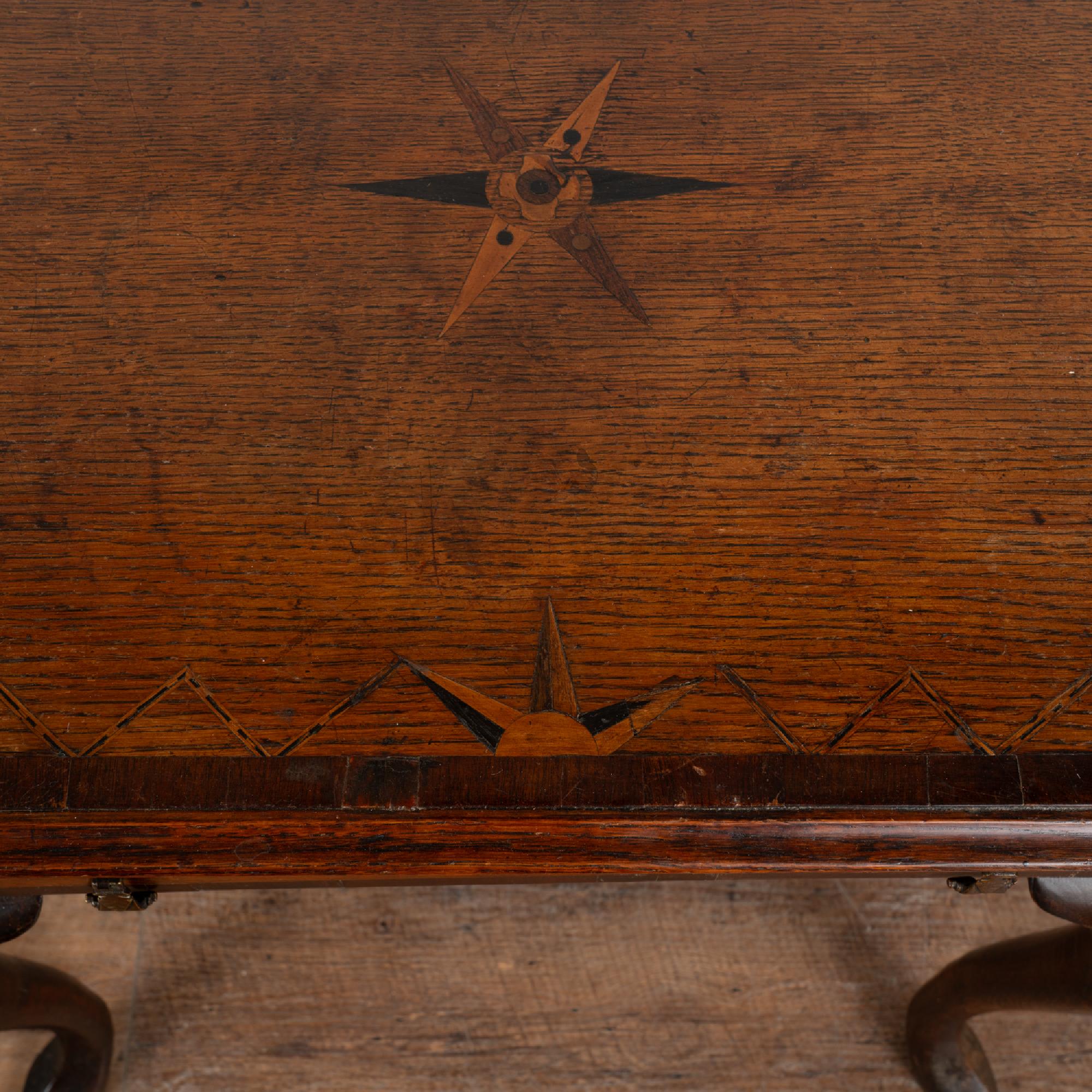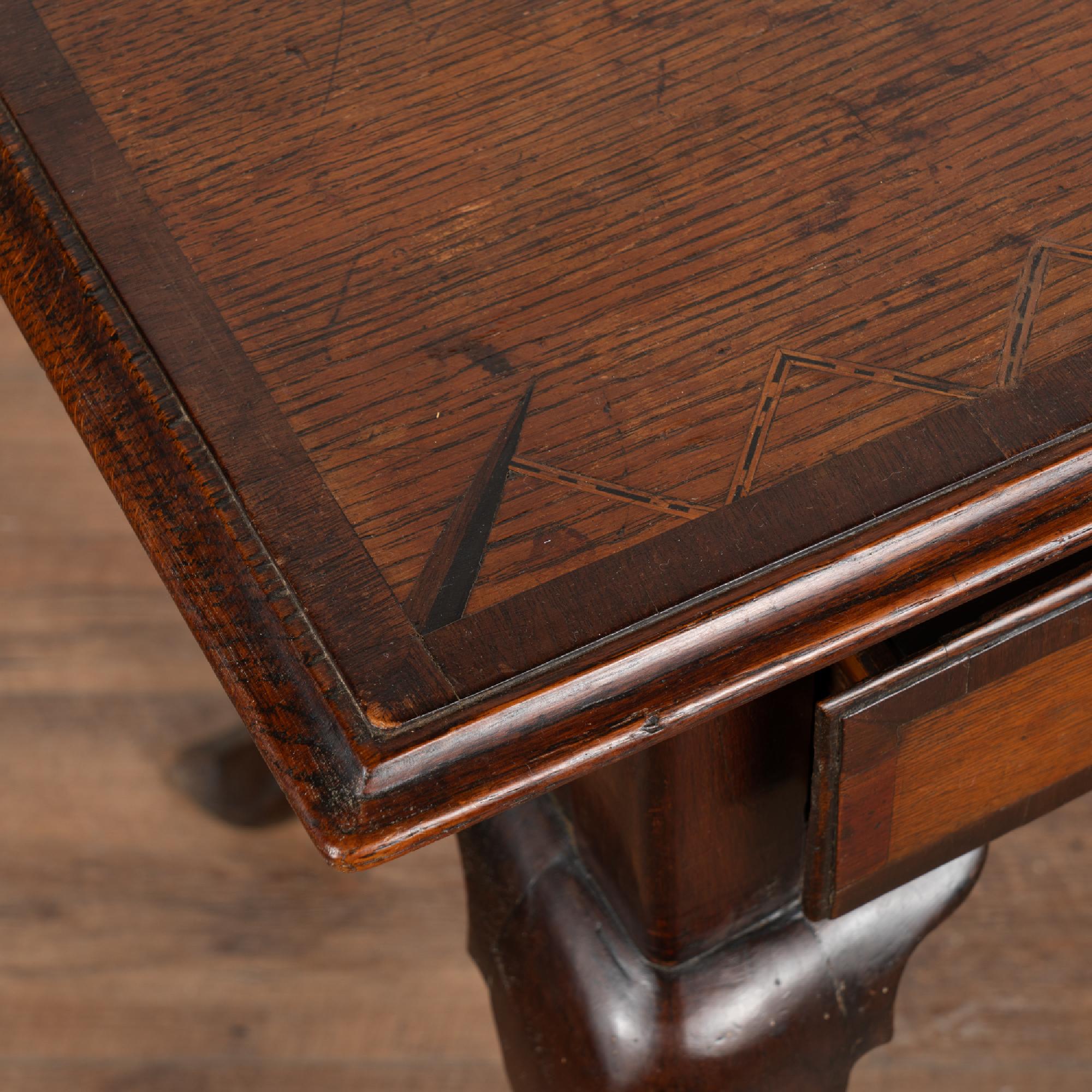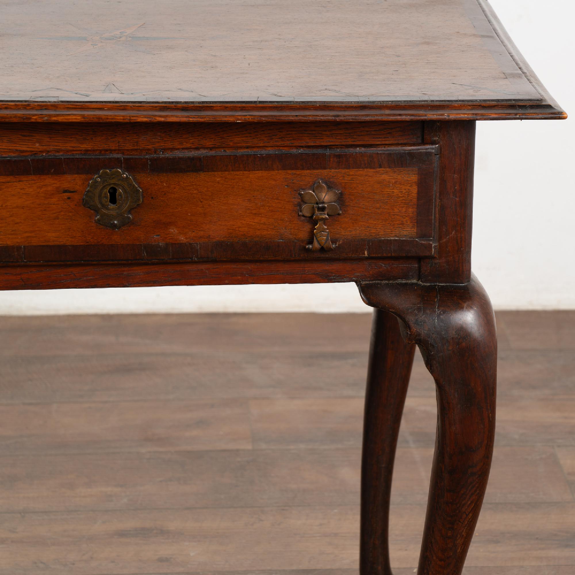 Oak side table with curved cabriolet legs, inlaid decorative starburst pattern and walnut trim.