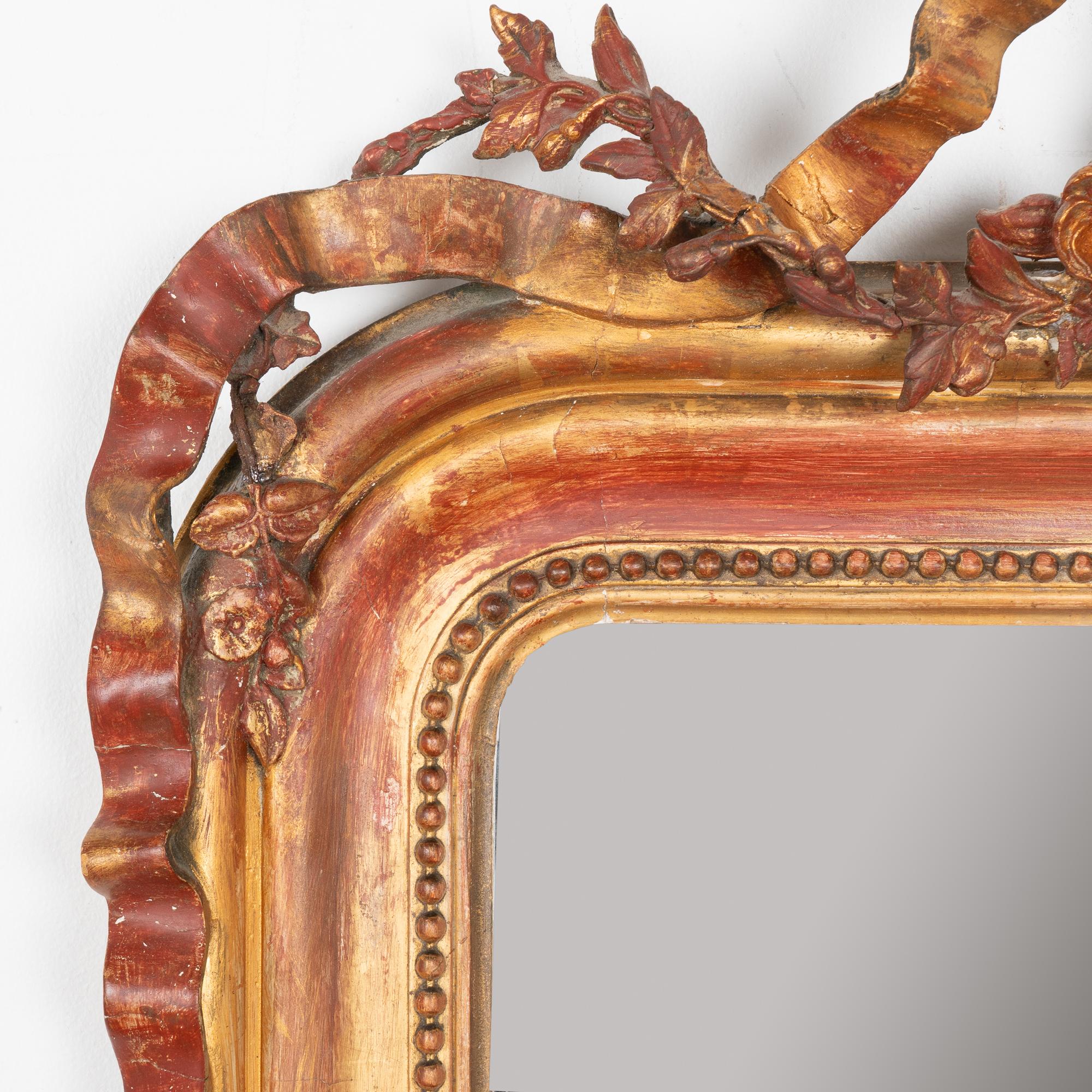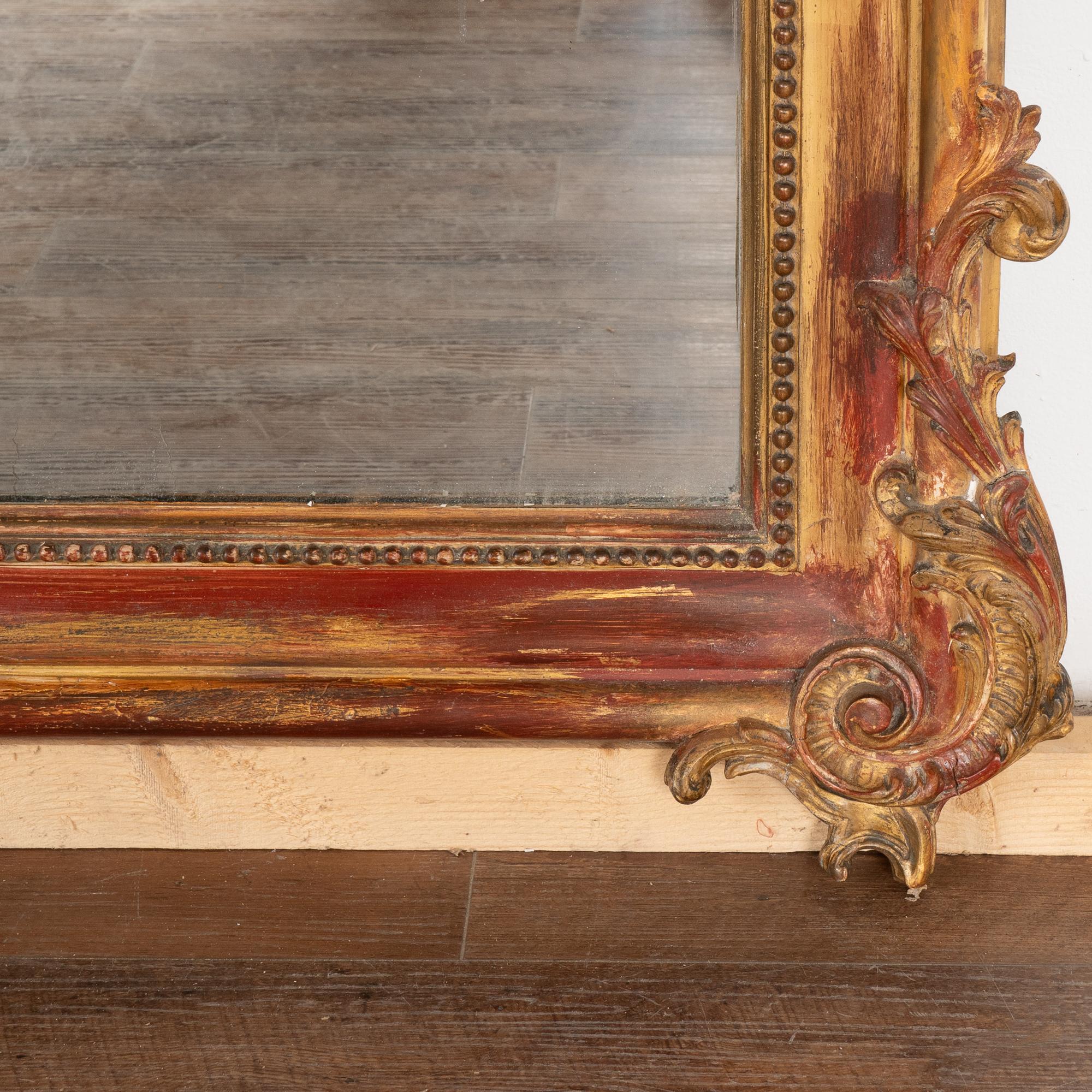 This striking gold gilt 6' mirror has rococo carved flourishes including elaborate ribbons with flowers. Burnished gold and red accent the beautiful carving.