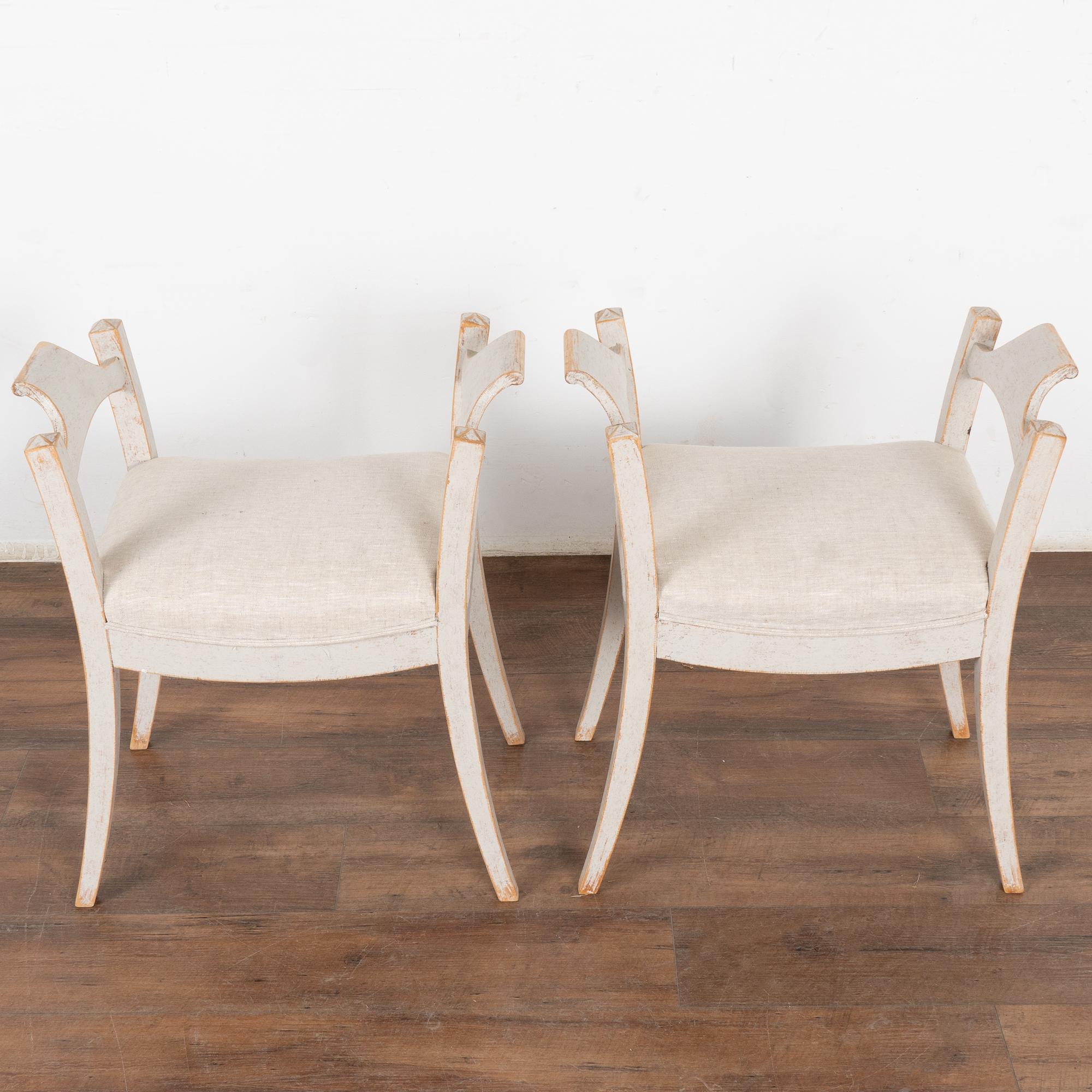 The soft patina of the later paint adds to their charm. Upholstered in light colored linen.