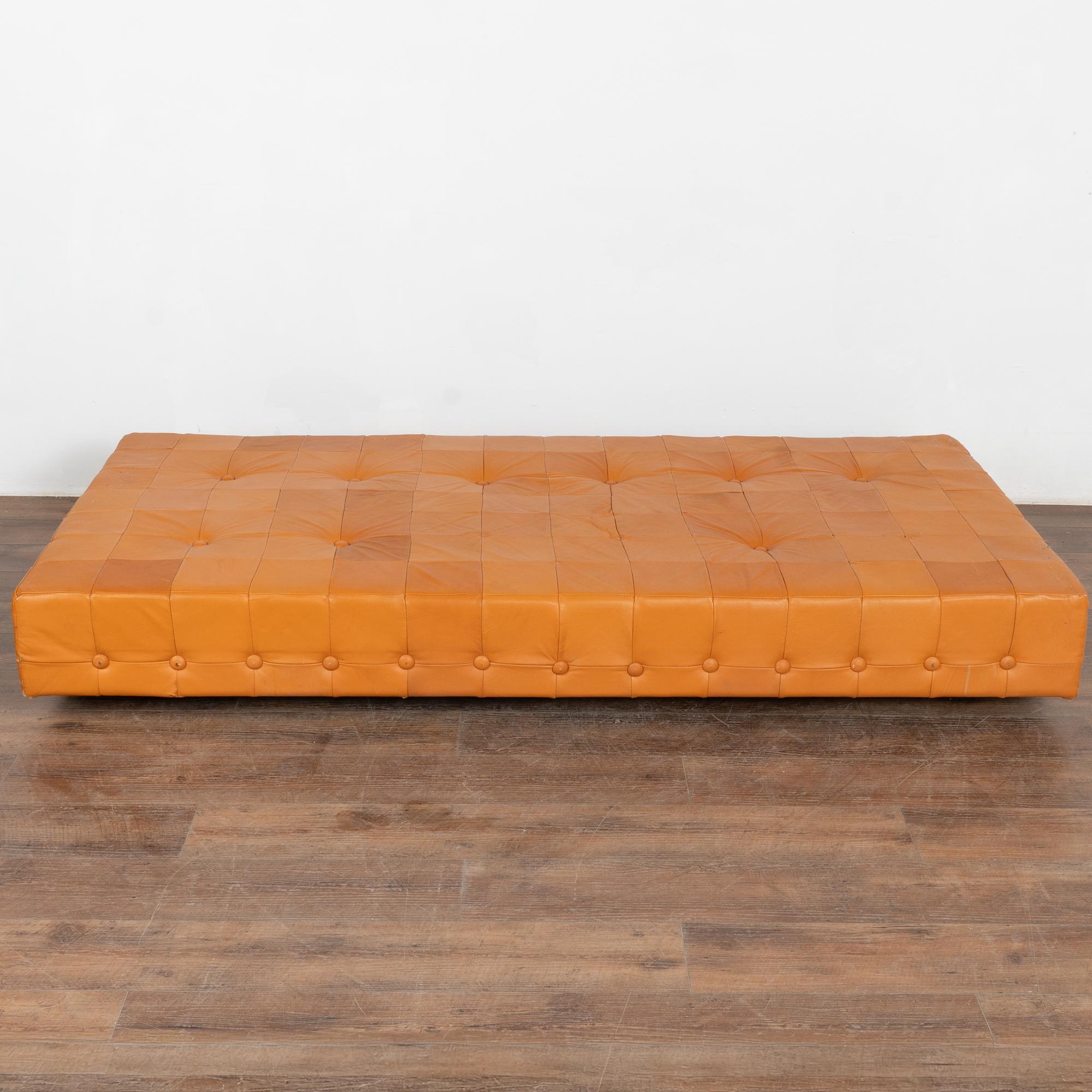 This fun mid-century find originally served as a daybed in Denmark. The original camel colored leather has buttons along the top and three sides (none on back). With the flat surface, it may serve as a large, low ottoman.