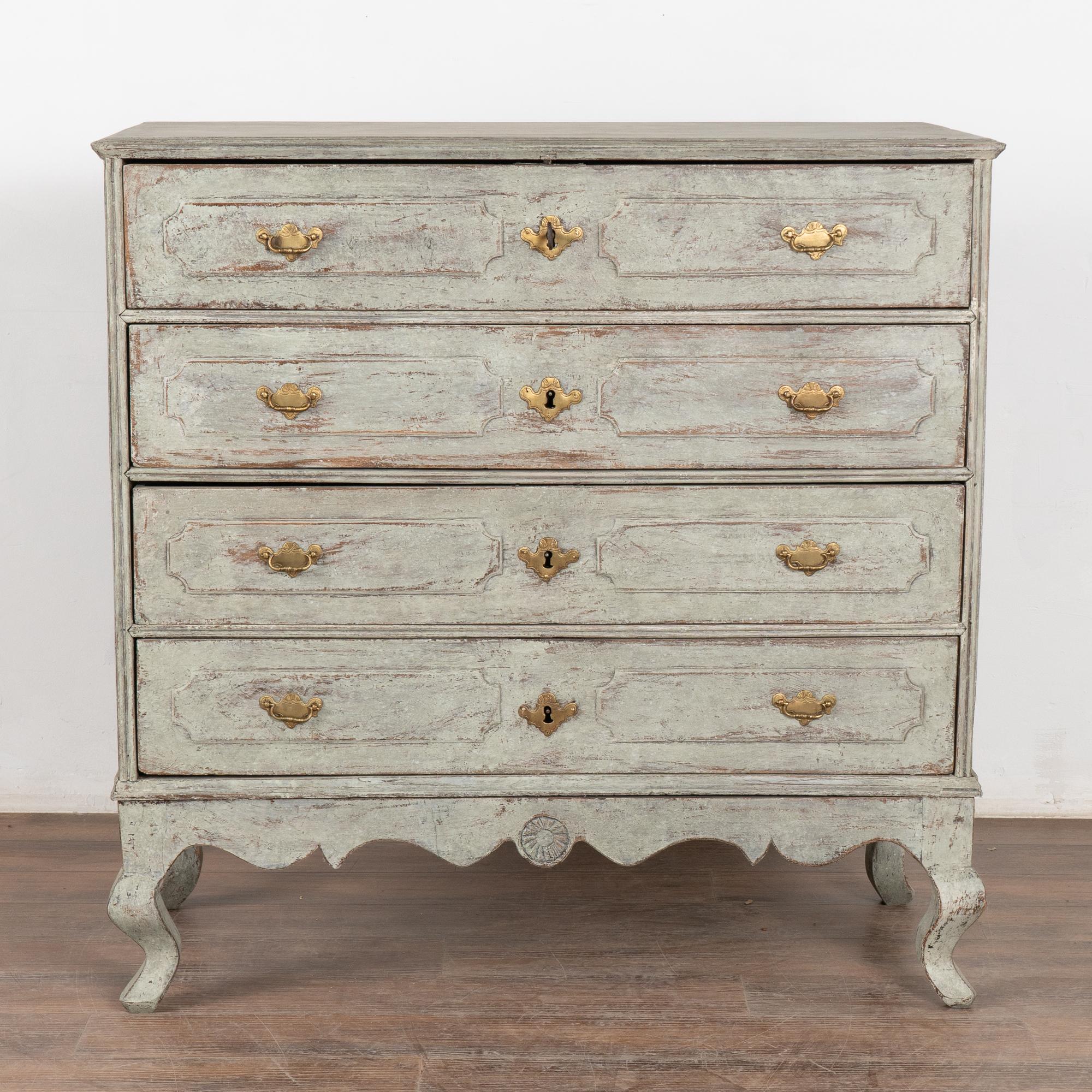 This large antique rococo chest of four drawers features panels on each drawer, carved skirt, brass hardware pulls and rests on cabriolet feet.