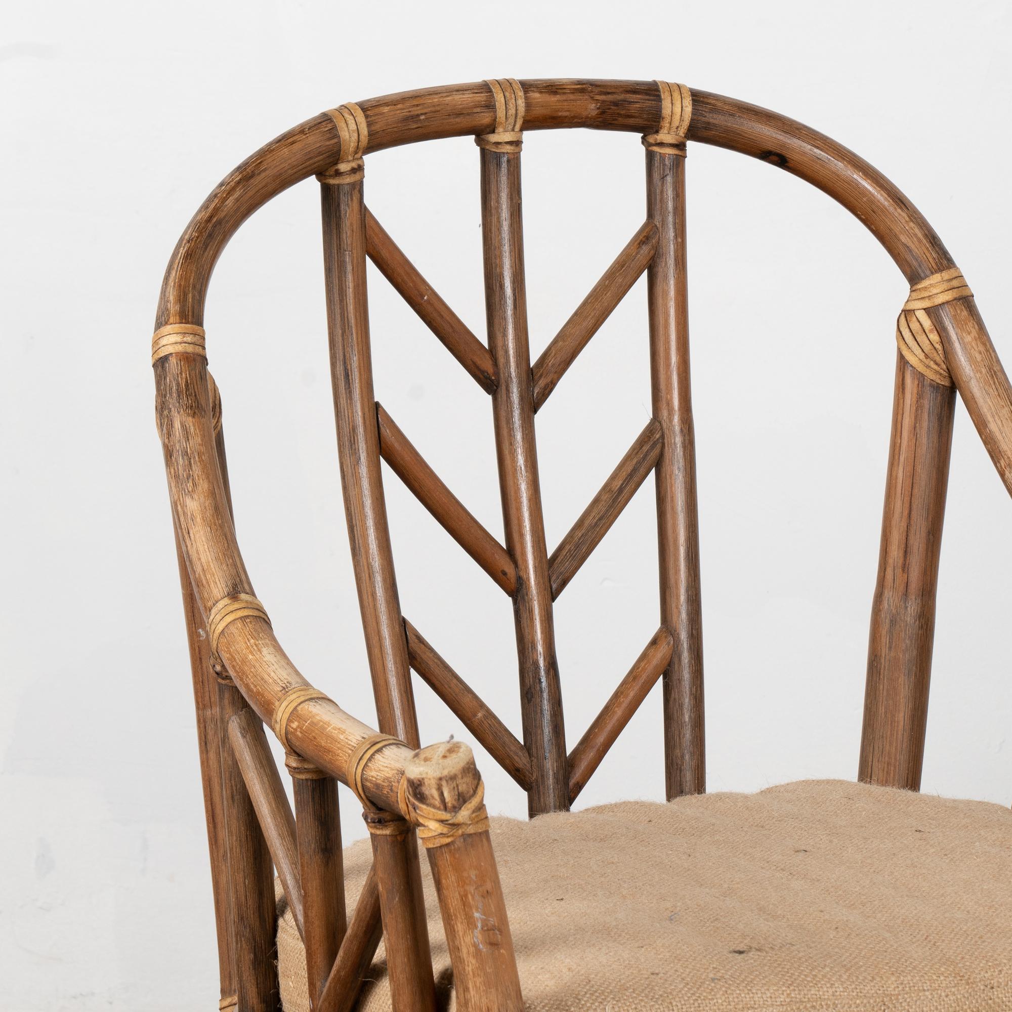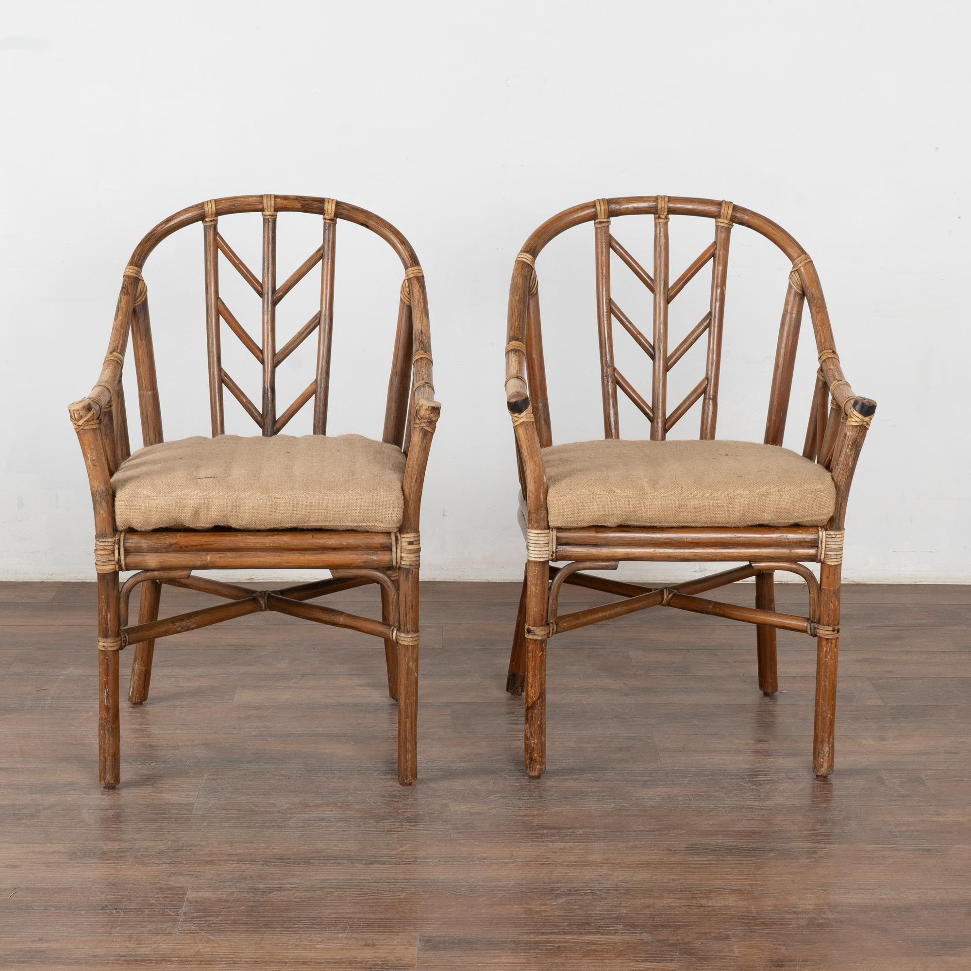 These timeless armchairs sit low and firm; they are in solid/stable condition and are ready to be placed and used. Wear/distress to finish seen in the bamboo, also scratches, etc.